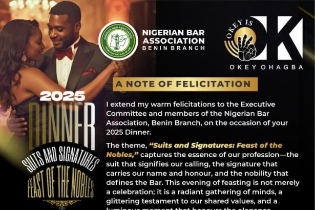 I extend my warmest felicitations to the leadership and entire members of the Nigerian Bar Association, Benin Branch, on the occasion of your 2025 Annual Dinner. The theme, *'Suits and…