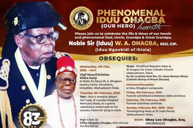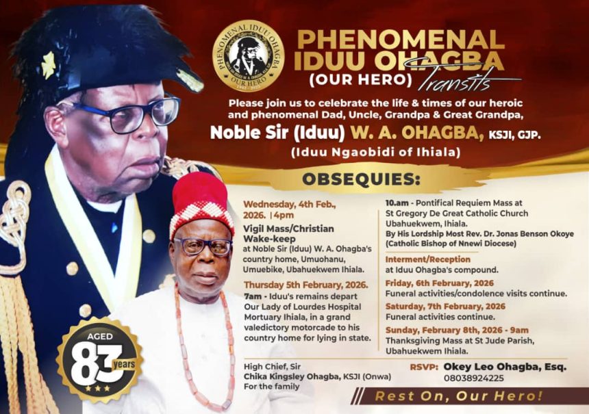 Please join us to celebrate the LIFE & TIMES of our heroic and phenomenal Dad, Uncle, GrandPa & Great GrandPa, Noble Sir (Iduu) W. A. Ohagba, KSJI, GJP. (Iduu Ngaobidi…