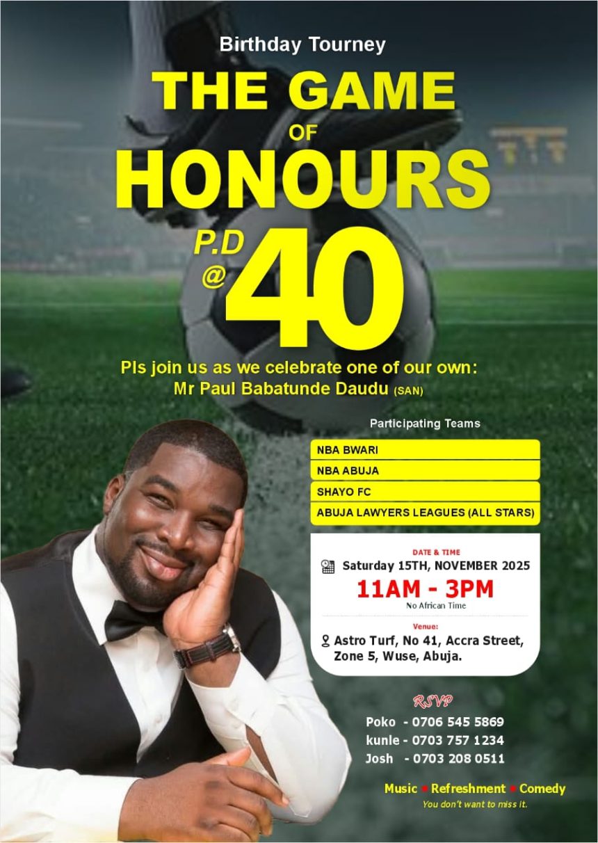 The legal community in Abuja is set for a remarkable moment as colleagues, friends, and well-wishers gather for a special birthday football tourney in honour of Mr. Paul Babatunde Daudu (SAN), a distinguished gentleman whose presence continues to elevate the spaces he walks into.