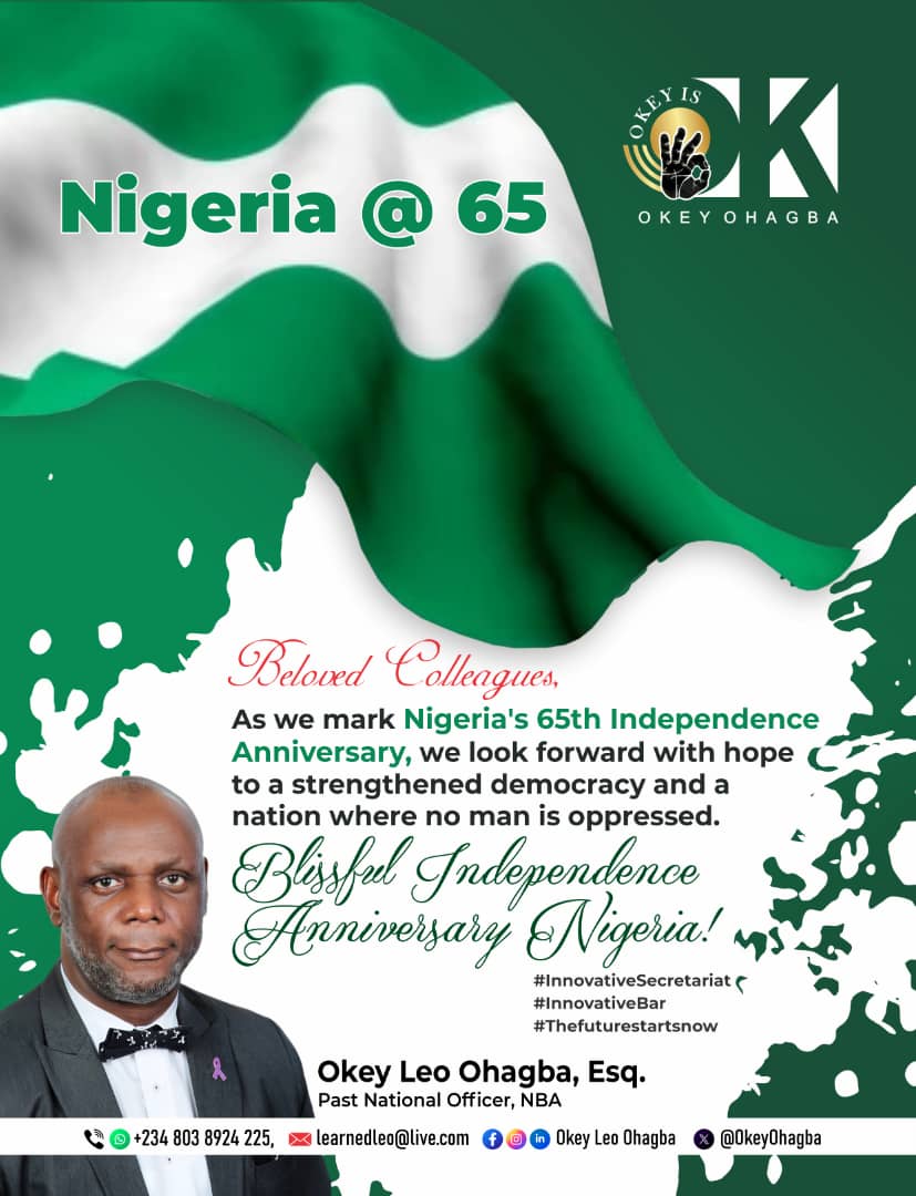 As Nigeria marks its 65th Independence Anniversary, former National Officer of the Nigerian Bar Association (NBA), Okey Leo Ohagba, Esq., has called on citizens, particularly lawyers and advocates of social justice, to rededicate themselves to building a nation anchored on justice, unity, peace, and prosperity.