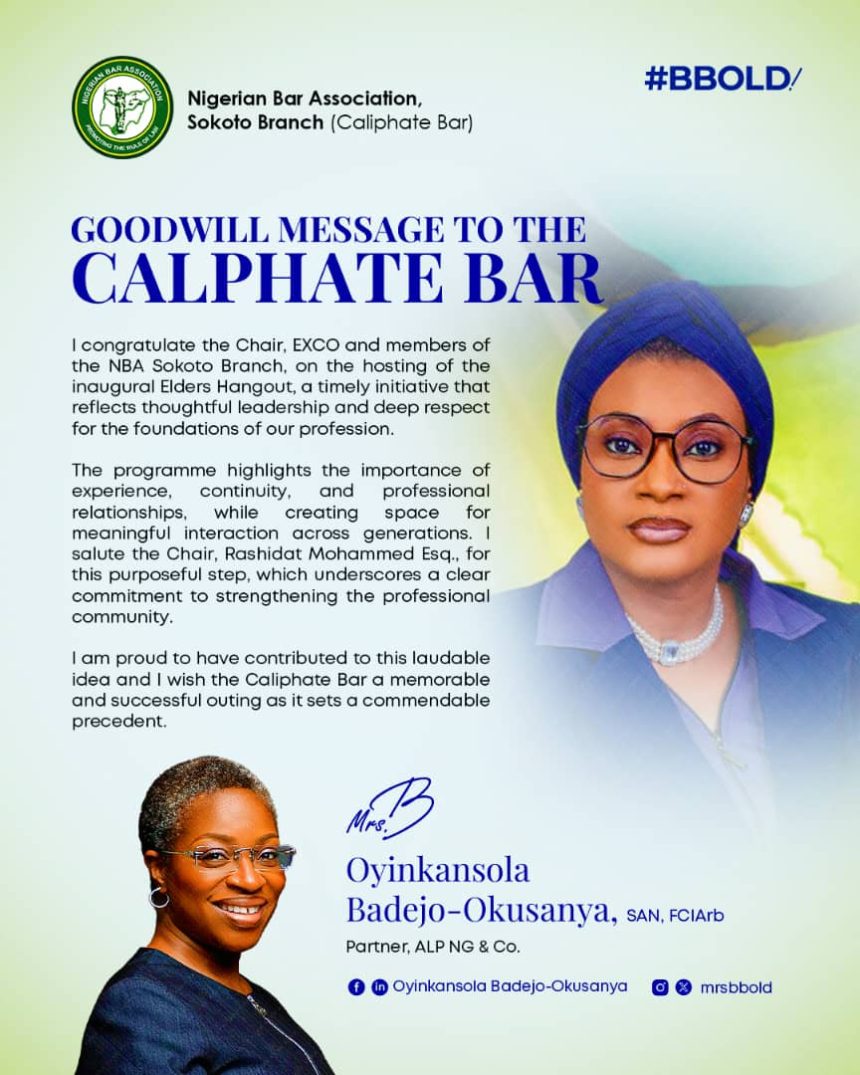 A Senior Advocate of Nigeria, Mrs. Oyinkansola Badejo-Okusanya, SAN, FCIArb, has applauded the Nigerian Bar Association (NBA), Sokoto Branch (Caliphate Bar), for hosting its inaugural Elders’ Hangout, describing the initiative as a timely and thoughtful step toward strengthening the legal profession.