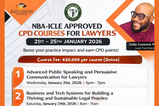The Nigerian Bar Association Institute of Continuing Legal Education (NBA-ICLE) has approved a series of Continuing Professional Development (CPD) courses for lawyers, scheduled to hold from 21st to 25th January…