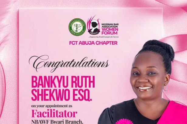 The Nigerian Bar Association Women Forum (NBAWF), Bwari Branch, has announced the appointment of Ruth Bankyu Shewo as the Substantive Facilitator of the Branch. Ruth Shewo previously served as the…
