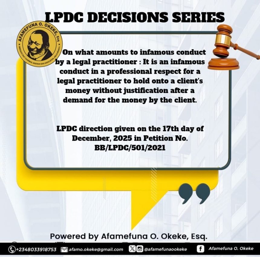 It is an infamous conduct in a professional respect for a legal practitioner to hold onto a client's money without justification after a demand for the money by the client.…