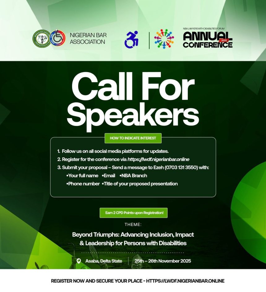 The Nigerian Bar Association Lawyers with Disabilities Forum (NBA-LWDF) invites passionate voices to take the stage at its 2025 Annual Conference, themed: