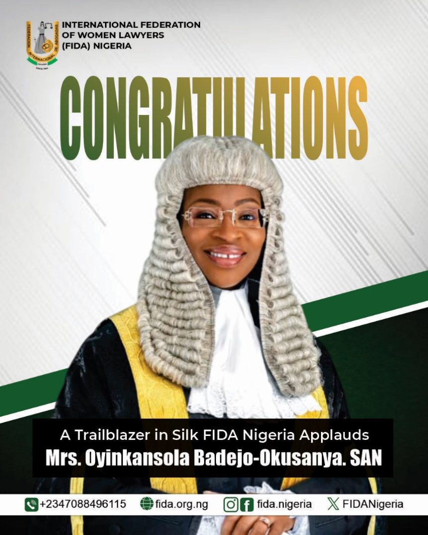 FIDA Nigeria proudly celebrates Mrs. Oyinkansola Badejo-Okusanya, one of our own on her elevation to the prestigious rank of Senior Advocate of Nigeria (SAN); a crowning achievement born of brilliance, resilience and unshakable dedication to the legal profession.