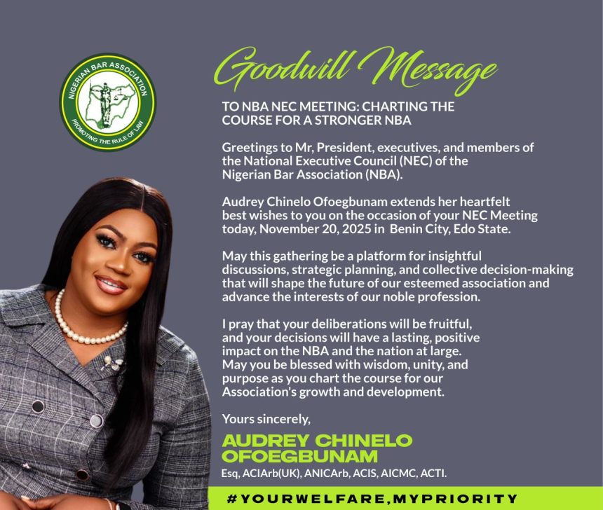 Audrey Chinelo Ofoegbunam extends her heartfelt best wishes to you on the occasion of your NEC Meeting today, November 20, 2025 in Benin City, Edo State.