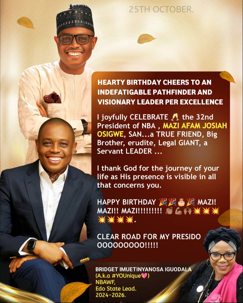 I joyfully CELEBRATE the 32nd President of NBA , Mazi Afam Josiah Osigwe, SAN…a TRUE FRIEND, Big Brother, erudite, Legal GIANT, a Servant LEADER…principled and courageous to take bold steps for the good of MAJORITY.