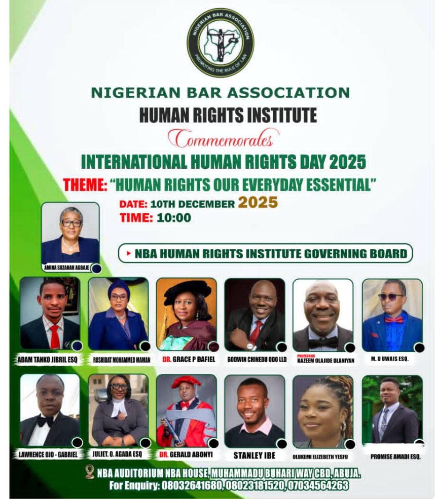 The Nigerian Bar Association, through its Human Rights Institute (HRI), is set to proudly commemorate the 2025 International Human Rights Day with a powerful event themed “Human Rights: Our Everyday Essential.”