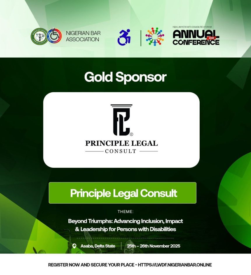 The Nigerian Bar Association Lawyers with Disabilities Forum (NBA-LWDF) has expressed profound appreciation to Principle Legal Consult, its Gold Sponsor for the upcoming NBA LWDF Annual Conference 2025.