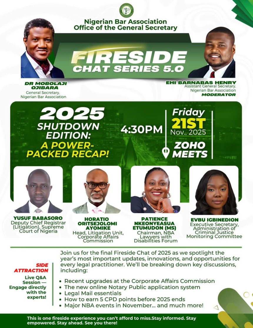 The Nigerian Bar Association (NBA), through the Office of the General Secretary led by Dr. Mobolaji Ojibara, will on Friday, 21st November 2025, host the grand finale edition of the NBA Fireside Chat Series 5.0.