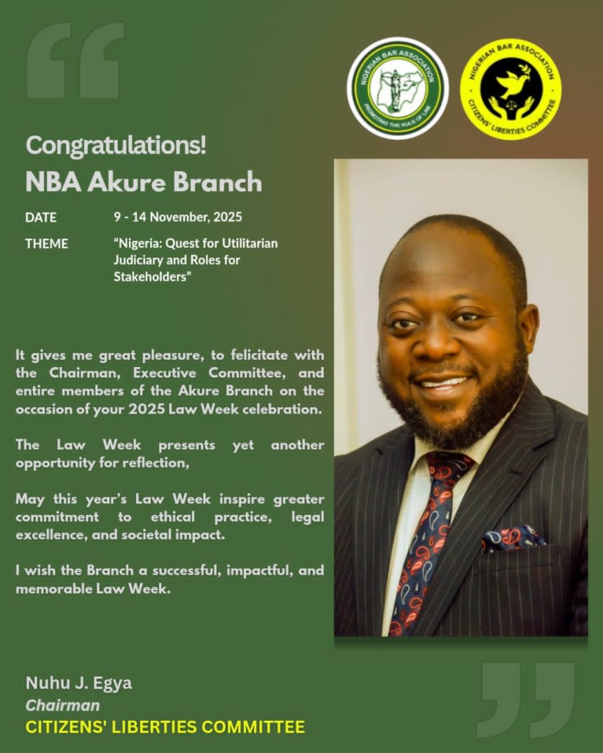 Nuhu J. Egya, Esq., Chairman of the Citizens Liberties Committee, National NBA, has extended heartfelt felicitations to the Chairman, Executive Committee, and members of the Nigerian Bar Association (NBA) Akure Branch on the occasion of their 2025 Law Week, held from November 9th to 14th under the chairmanship of Onimisi F. Umar, Esq.