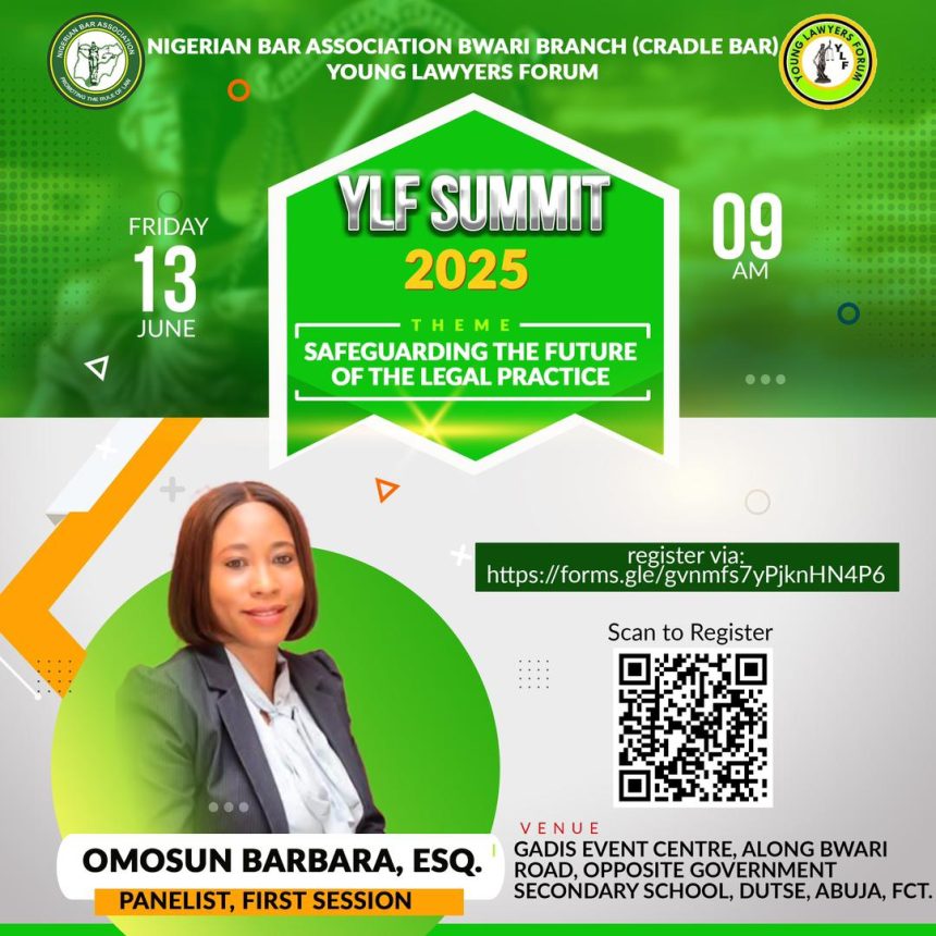 ABUJA, FCT – The Nigerian Bar Association Young Lawyers’ Forum (YLF), Bwari Branch, is set to host its highly anticipated 2025 Summit on Friday, June 13, 2025. The summit, themed “Safeguarding the Future of the Legal Practice in Nigeria,” will take place at the Gadis Event Centre, Dutse, Abuja, commencing at 9:00 AM Prompt.