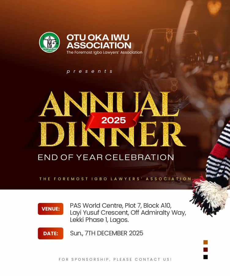 The foremost association of Igbo lawyers, Otu Oka Iwu, is set to host its glamorous 2025 Annual Dinner and End-of-Year Celebration, an evening of elegance, laughter, and cultural pride!