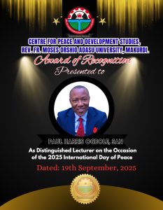 The event, organised by the Centre for Peace and Development Studies, Rev. Fr Moses Orshio Adasu University (formerly Benue State University), Makurdi, brought together lecturers, students, political leaders, traditional rulers, and other distinguished guests.